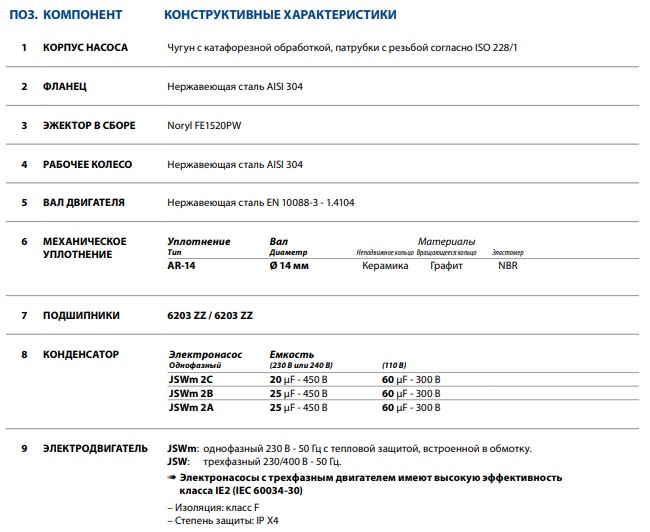 Насосна частина складається з корпусу виготовленого з чавуну (модель JDW, JSW, PK,PKS) або з нержавіючої сталі (модель JCR) та вбудованих усередині пластмасових труб (т.зв. трубка Вентурі або ежектор), робоче колесо та дифузор з полімерного матеріалу GFN2 (Noril) та вал з нержавіючої сталі.