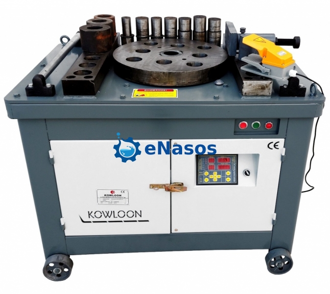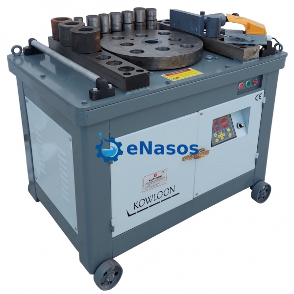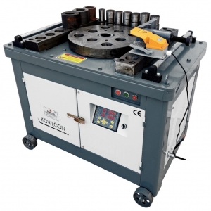 Електромеханічний верстат для згинання арматури GW-60 використовується для вигину арматури різного класу та діаметру. Даний верстат дає можливість виготовити петлі, скоби, заставні деталі та зробити подвійний вигин. Процес вигину арматури здійснюється навколо центрального валу, внаслідок переміщення по зовнішній поверхні арматури згинального валка, який спирається на завзятий штир. З високої якості комплектуючих складається система автоматики згинального верстата, яка має низку захисних електричних пристроїв. Одними з основних переваг верстата для згинання арматури GW-60 є: швидкість і точність установки кута вигину, наявність педального та ручного управління, відмінна продуктивність, легка експлуатація, розташування редукторної системи згинального верстата в масляному піддоні, простота електричного механізму (зменшує ймовірність поломки), функція реверсу для влаштування згинання арматури, можливість двостороннього загинання. Даний згинальний верстат оснащений електричним двигуном потужністю 5,5 кВт. Робоча напруга верстата - 380 вольт. Діаметр арматури для згинання визначається в межах від 9 до 60 мм. Вага даного верстата 580 кг.