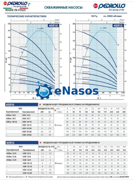 Максимальна глибина занурення під дзеркало води: – 200 м із двигуном 4PD – 100 м із двигуном 4PS Монтажне положення: – вертикальне – горизонтальне, за наступних обмежень: 4SR1 - 4SR1.5 - 4SR2 - 4SR4 до 23 ступенів 4SR6 - 4SR8 до 17 ступенів