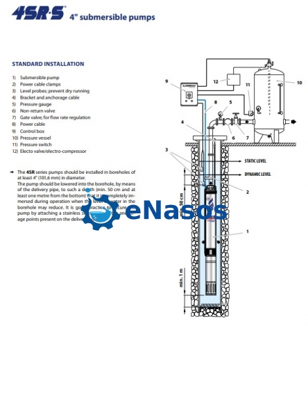 Максимальна глибина занурення під дзеркало води: – 200 м із двигуном 4PD – 100 м із двигуном 4PS Монтажне положення: – вертикальне – горизонтальне, за наступних обмежень: 4SR1 - 4SR1.5 - 4SR2 - 4SR4 до 23 ступенів 4SR6 - 4SR8 до 17 ступенів