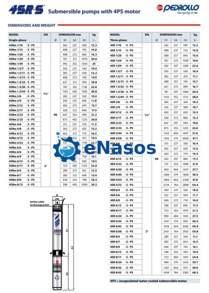 Максимальна глибина занурення під дзеркало води: – 200 м із двигуном 4PD – 100 м із двигуном 4PS Монтажне положення: – вертикальне – горизонтальне, за наступних обмежень: 4SR1 - 4SR1.5 - 4SR2 - 4SR4 до 23 ступенів 4SR6 - 4SR8 до 17 ступенів
