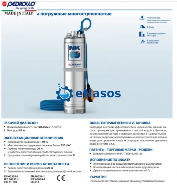 Колодязний насос Pedrollo NKm 4/4-GE завдяки високій ефективності і надійності рекомендуються для перекачування чистої води і широко використовуються в побуті, комунальному та сільському господарстві, для організації водопостачання в поєднанні з системами підтримки тиску, а також для поливання садів і городів, підвищення тиску в мережі і т. п.