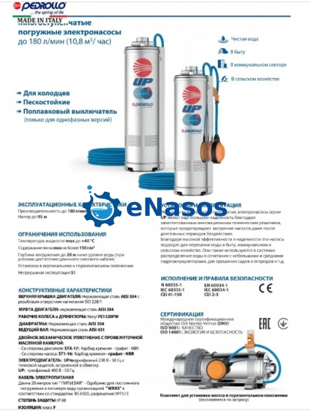 Конструктивні характеристики колодязних насосів Pedrollo серії UP