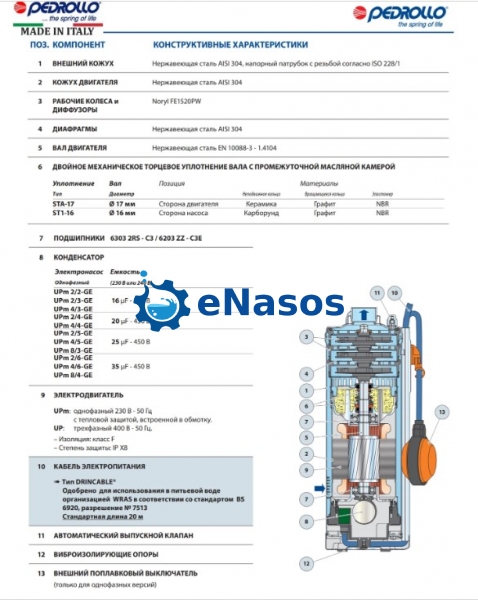 - UPm (однофазний) Кабель електроживлення погружного типу довжиною 20 метрів сертифікований для питної води (зі знімним з'єднанням і розподільною коробкою з конденсатором 1.5 і 2.2 кВт для P2)