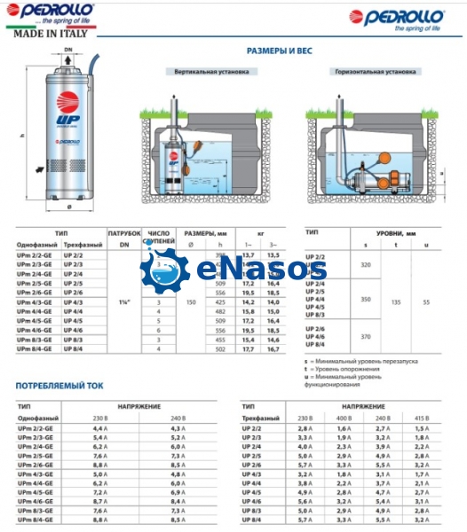 - UPm (однофазний) 220 - 240В-50 Гц з тепловим захистом, вбудованою в обмотку при потужності до 1,5 кВт.