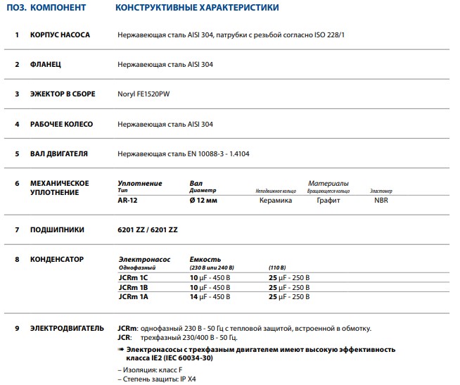 Насосная часть состоит из корпуса изготовленного из чугуна (модель JDW, JSW, PK,PKS) или из нержавеющей стали (модель JCR) и встроенных внутри пластмассовых труб (т.н. трубка Вентури или эжектор), рабочее колесо и диффузор из полимерного материала GFN2 (Noril) и вал из нержавеющей стали.