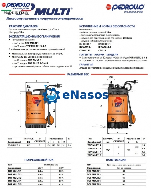 Погружний, дренажний насос Pedrollo TOP MULTI 3