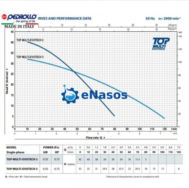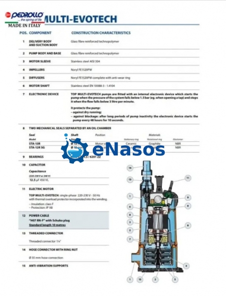 У Pedrollo Top Multi EvoTech електродвигун розташований у верхній частині установки, поруч з напірним патрубком і охолоджується водою, що перекачується. Робочі колеса і корпус установки виготовляються з високоякісних композитних матеріалів, вал з ротором і сітчастий фільтр - з нержавіючої сталі. Установка Top Multi EvoTech поставляється з перехідником з вбудованим зворотним клапаном на напірний патрубок з приєднанням Rp 1".