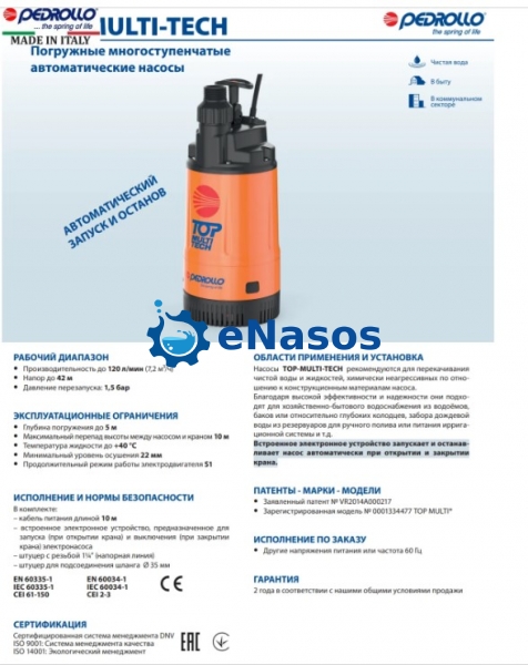 Погружний, дренажний насос Pedrollo TOP MULTI-TECH 2